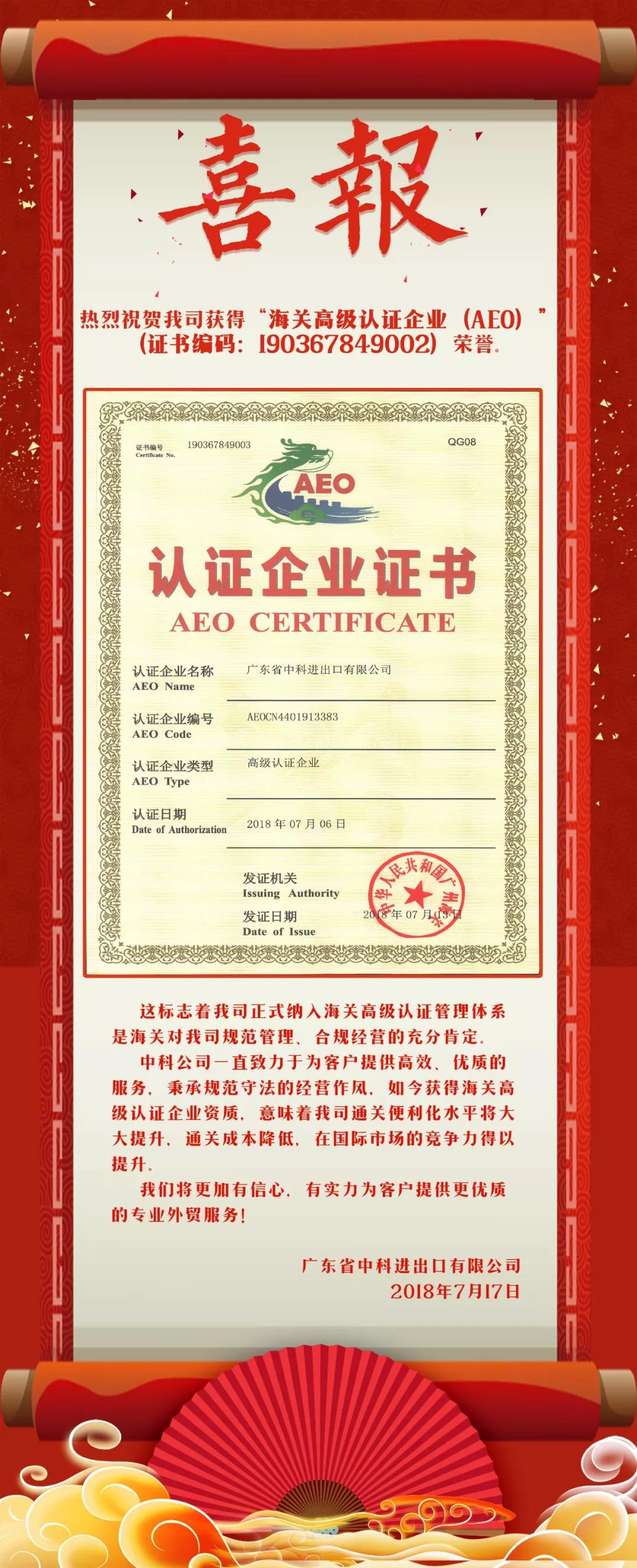 熱烈祝賀我司獲得“海關高級認證企業(AEO)”榮譽