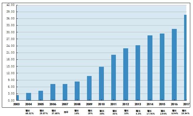 數據分析圖一:《中科公司2003-2017年營業額數據圖》(單位:億元)