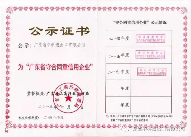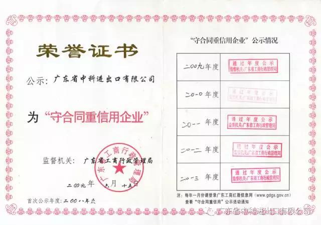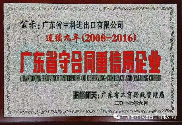我司繼2008年首次申請并獲得“廣東省守合同重信用企業”稱號以來,至2016年度已連續九年獲得此榮譽稱號。這是工商部門對我司的認可,更是廣大客戶對我司的認可。